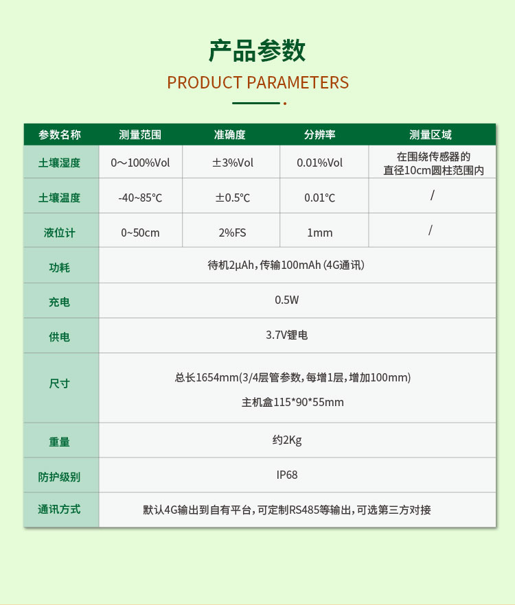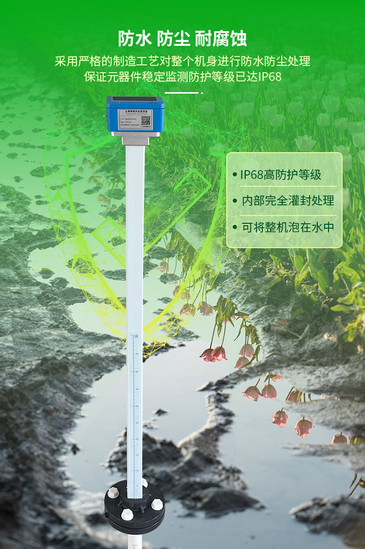 土壤墒情水位一体监测仪,专为现代农田、果园、温室大棚及科研实验量身打造,精准灌溉,降本增收,守护每一颗果实。进口传感器,地下部分准确测量土壤中的水分含量和温度,地上部分测量液位高度,确保数据的可靠性。2uA低功耗超长续航,锂电池加太阳能充电系统,满配电池在阴雨天,可工作200天以上。IP68防水级材质,抗离子干扰,适应复杂土壤环境。4G传输,支持PC端与手机APP双平台查看,及时干预,科学种植。