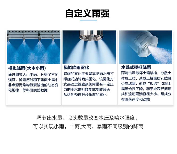 野外人工模拟降雨系统能够精确模拟不同强度、频率和持续时间的降雨,为研究人员提供一个可控制、可重复的降雨环境。野外人工模拟降雨系统是一款集高精度、多功能于一体的先进设备。它专为环境研究、农业试验、城市规划和景观设计等多个领域定制,能够精确模拟不同强度、频率和持续时间的降雨,为用户提供一个高度可控制、可重复的降雨环境。